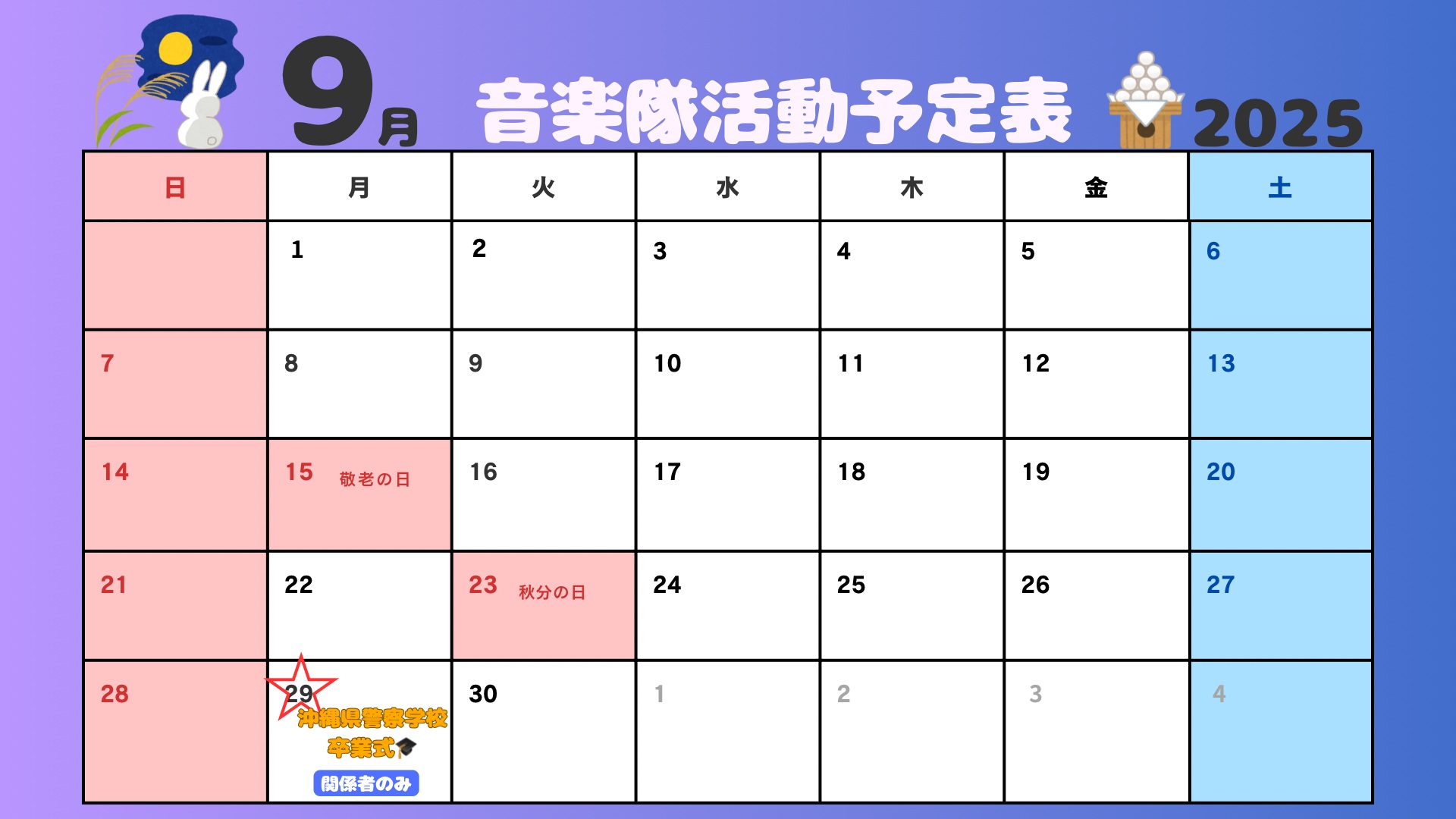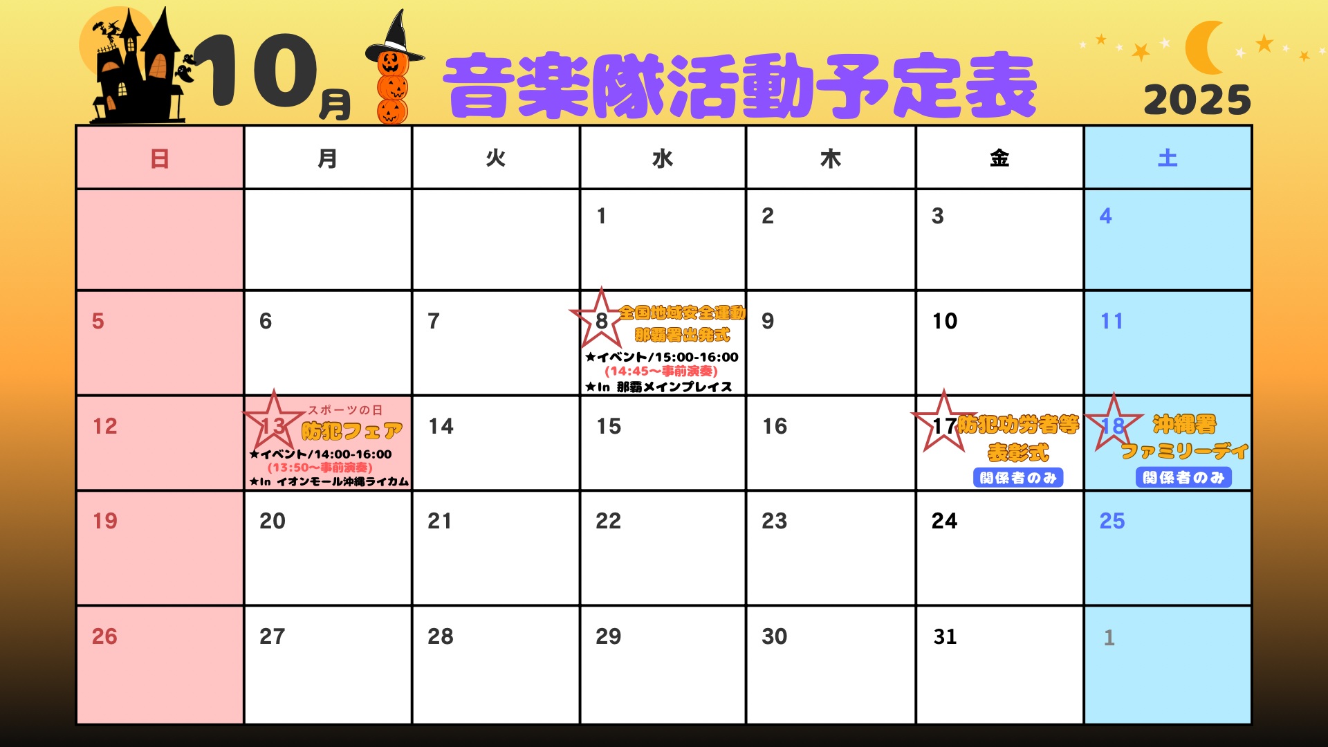 ~沖縄県警察音楽隊活動予定~ 【9月の音楽隊出動スケジュール】 【10月の音楽隊出動スケジュール】 *イベントは天候や都合により変更となる場合があります。 *一般公開イベントについては、ぜひ会場に足をお運びください。 TOPページはこちら♪